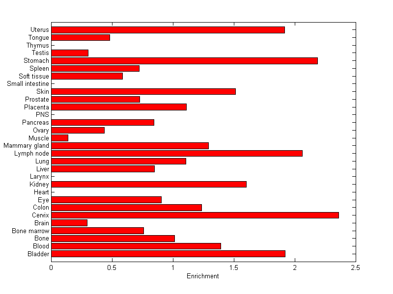 The expression level is normalized with tissue-library size. Each value for a gene in a tissue is a ratio of observed ESTs to the expected one in this tissue. The expected number of ESTs is the product of total ESTs of the gene and the fraction of total ESTs in the tissue among all ESTs in 30 tissues.