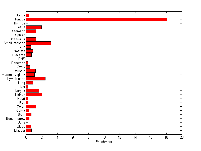 The expression level is normalized with tissue-library size. Each value for a gene in a tissue is a ratio of observed ESTs to the expected one in this tissue. The expected number of ESTs is the product of total ESTs of the gene and the fraction of total ESTs in the tissue among all ESTs in 30 tissues.