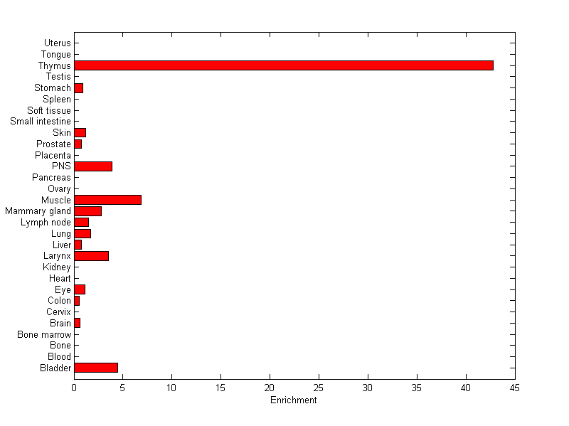 About the profile: The expression level is normalized with tissue-library size. Each value for a gene in a tissue is a ratio of observed ESTs to the expected one in this tissue. The expected number of ESTs is the product of total ESTs of the gene and the fraction of total ESTs in the tissue among all ESTs in 30 tissues. Summary: This gene is preferentially expressed in [muscle, thymus] Download: |
