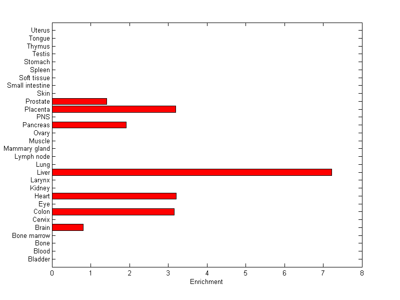 The expression level is normalized with tissue-library size. Each value for a gene in a tissue is a ratio of observed ESTs to the expected one in this tissue. The expected number of ESTs is the product of total ESTs of the gene and the fraction of total ESTs in the tissue among all ESTs in 30 tissues.