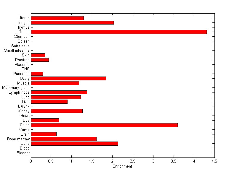 The expression level is normalized with tissue-library size. Each value for a gene in a tissue is a ratio of observed ESTs to the expected one in this tissue. The expected number of ESTs is the product of total ESTs of the gene and the fraction of total ESTs in the tissue among all ESTs in 30 tissues.
