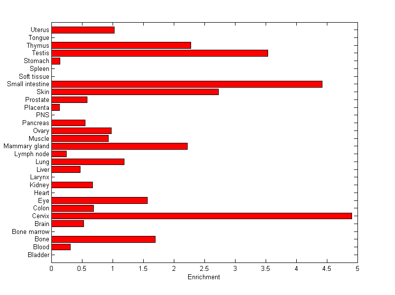 The expression level is normalized with tissue-library size. Each value for a gene in a tissue is a ratio of observed ESTs to the expected one in this tissue. The expected number of ESTs is the product of total ESTs of the gene and the fraction of total ESTs in the tissue among all ESTs in 30 tissues.