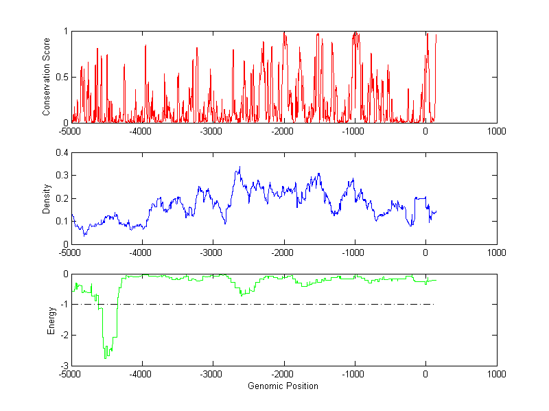 The energy profile (green curve) is about energy for module detection based on TF interaction. The positions with energy less than -1 indicate the existence of CRMs.