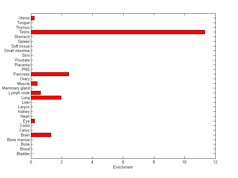 The expression level is normalized with tissue-library size. Each value for a gene in a tissue is a ratio of observed ESTs to the expected one in this tissue. The expected number of ESTs is the product of total ESTs of the gene and the fraction of total ESTs in the tissue among all ESTs in 30 tissues.