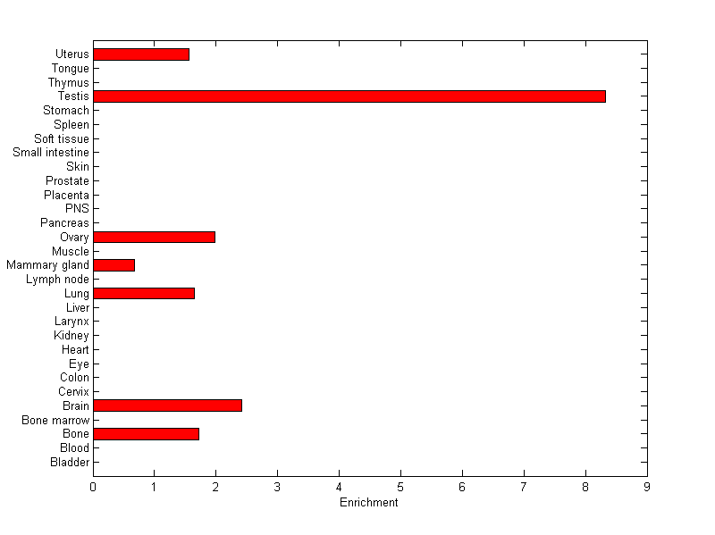 The expression level is normalized with tissue-library size. Each value for a gene in a tissue is a ratio of observed ESTs to the expected one in this tissue. The expected number of ESTs is the product of total ESTs of the gene and the fraction of total ESTs in the tissue among all ESTs in 30 tissues.
