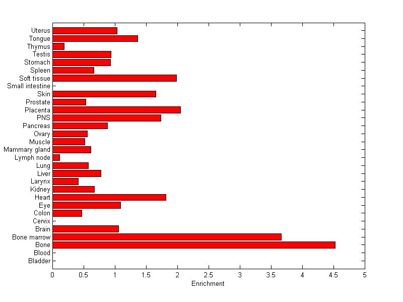 The expression level is normalized with tissue-library size. Each value for a gene in a tissue is a ratio of observed ESTs to the expected one in this tissue. The expected number of ESTs is the product of total ESTs of the gene and the fraction of total ESTs in the tissue among all ESTs in 30 tissues.