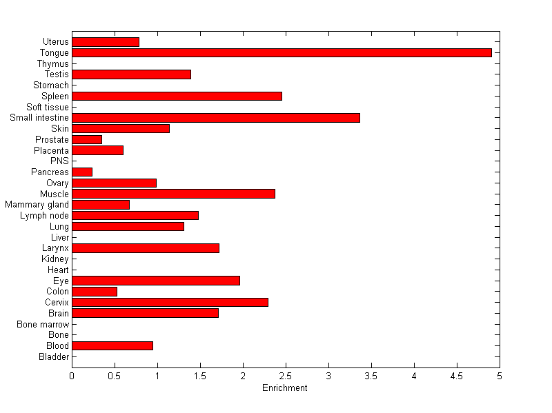 The expression level is normalized with tissue-library size. Each value for a gene in a tissue is a ratio of observed ESTs to the expected one in this tissue. The expected number of ESTs is the product of total ESTs of the gene and the fraction of total ESTs in the tissue among all ESTs in 30 tissues.