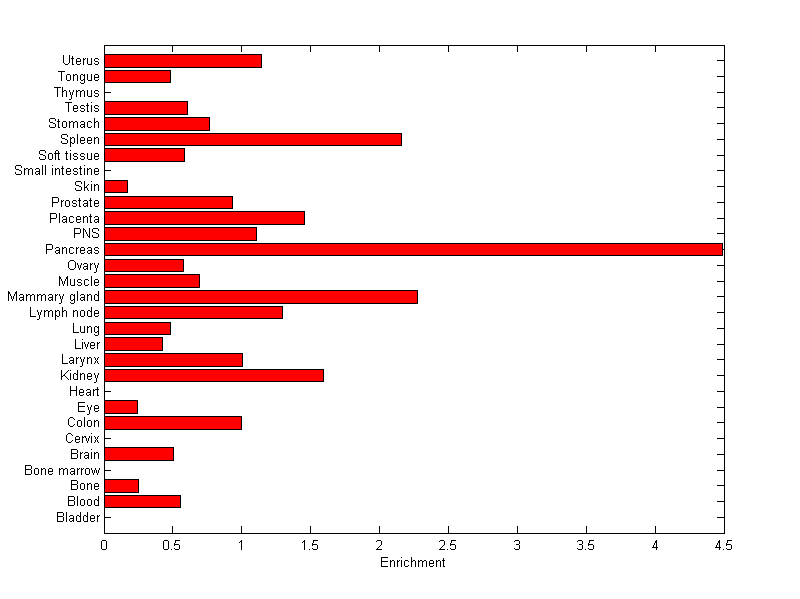 The expression level is normalized with tissue-library size. Each value for a gene in a tissue is a ratio of observed ESTs to the expected one in this tissue. The expected number of ESTs is the product of total ESTs of the gene and the fraction of total ESTs in the tissue among all ESTs in 30 tissues.