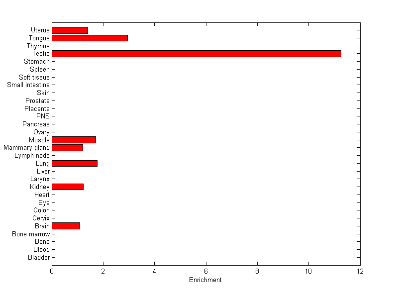 About the profile: The expression level is normalized with tissue-library size. Each value for a gene in a tissue is a ratio of observed ESTs to the expected one in this tissue. The expected number of ESTs is the product of total ESTs of the gene and the fraction of total ESTs in the tissue among all ESTs in 30 tissues. Summary: This gene is preferentially expressed in [testis] Download: |