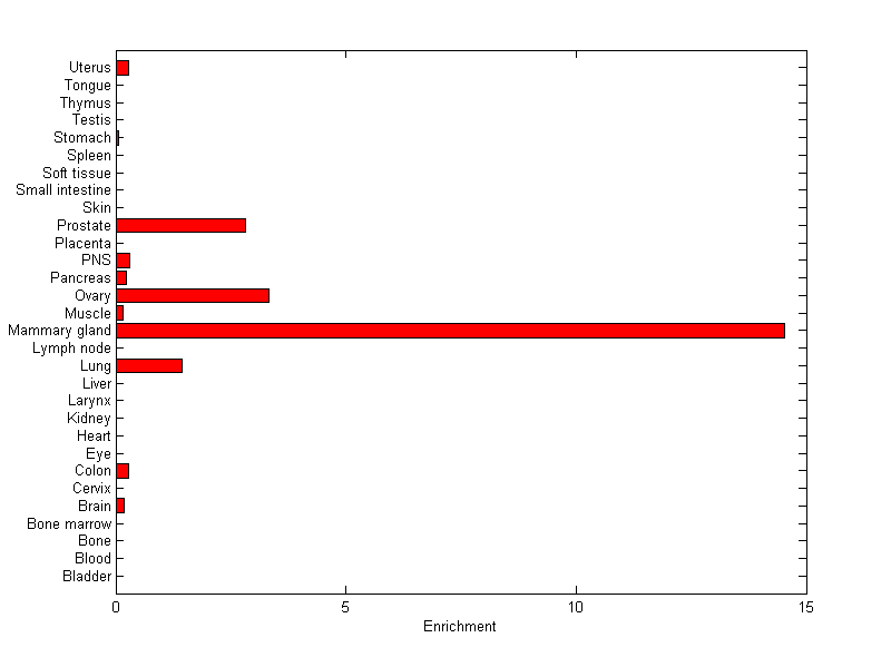 The expression level is normalized with tissue-library size. Each value for a gene in a tissue is a ratio of observed ESTs to the expected one in this tissue. The expected number of ESTs is the product of total ESTs of the gene and the fraction of total ESTs in the tissue among all ESTs in 30 tissues.