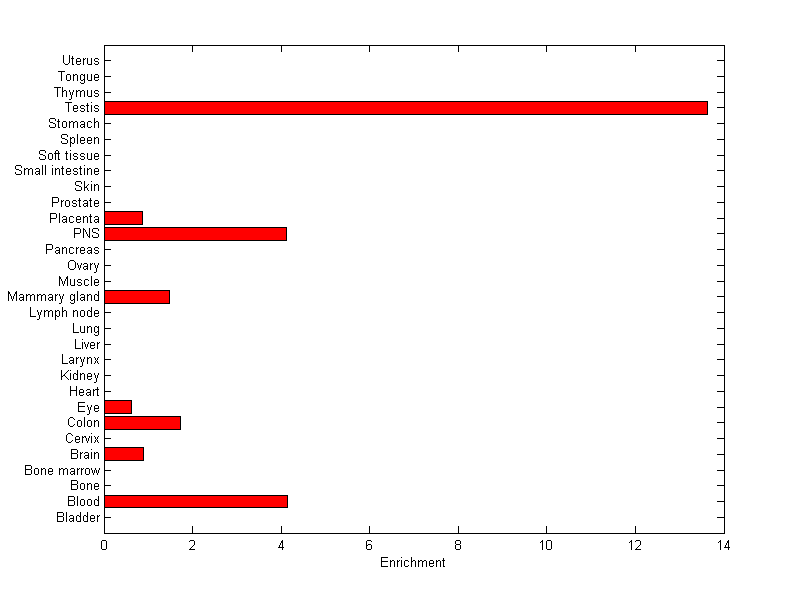 About the profile: The expression level is normalized with tissue-library size. Each value for a gene in a tissue is a ratio of observed ESTs to the expected one in this tissue. The expected number of ESTs is the product of total ESTs of the gene and the fraction of total ESTs in the tissue among all ESTs in 30 tissues. Summary: This gene is preferentially expressed in [testis] Download: |