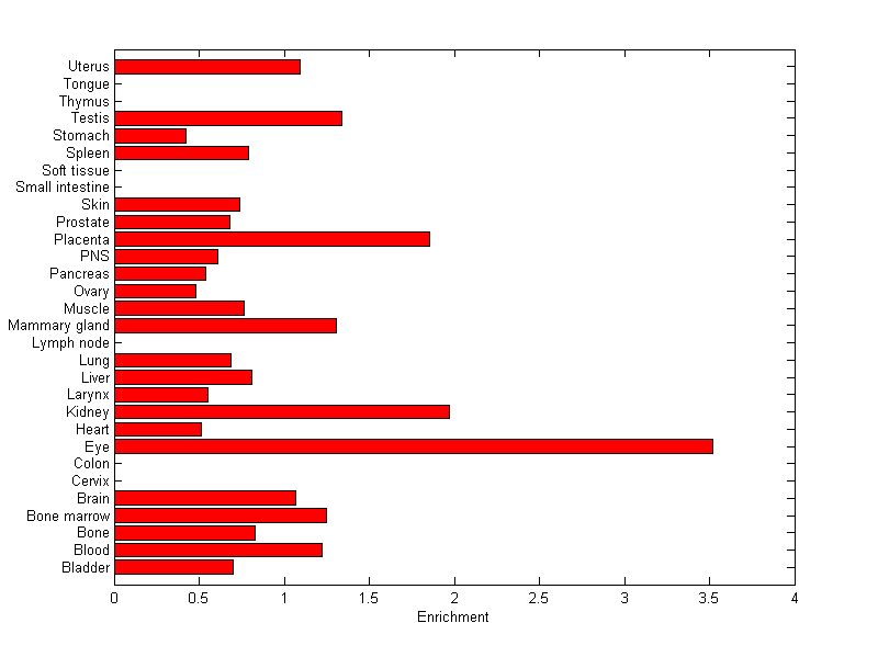The expression level is normalized with tissue-library size. Each value for a gene in a tissue is a ratio of observed ESTs to the expected one in this tissue. The expected number of ESTs is the product of total ESTs of the gene and the fraction of total ESTs in the tissue among all ESTs in 30 tissues.