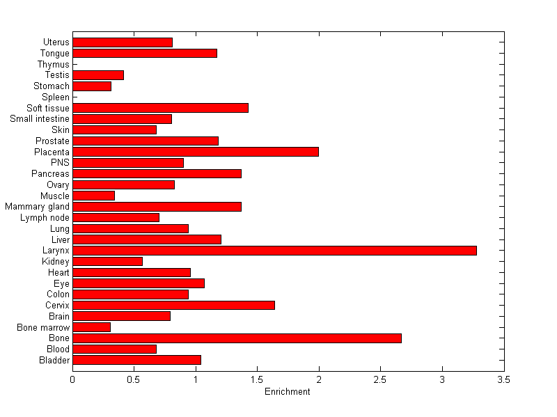 The expression level is normalized with tissue-library size. Each value for a gene in a tissue is a ratio of observed ESTs to the expected one in this tissue. The expected number of ESTs is the product of total ESTs of the gene and the fraction of total ESTs in the tissue among all ESTs in 30 tissues.