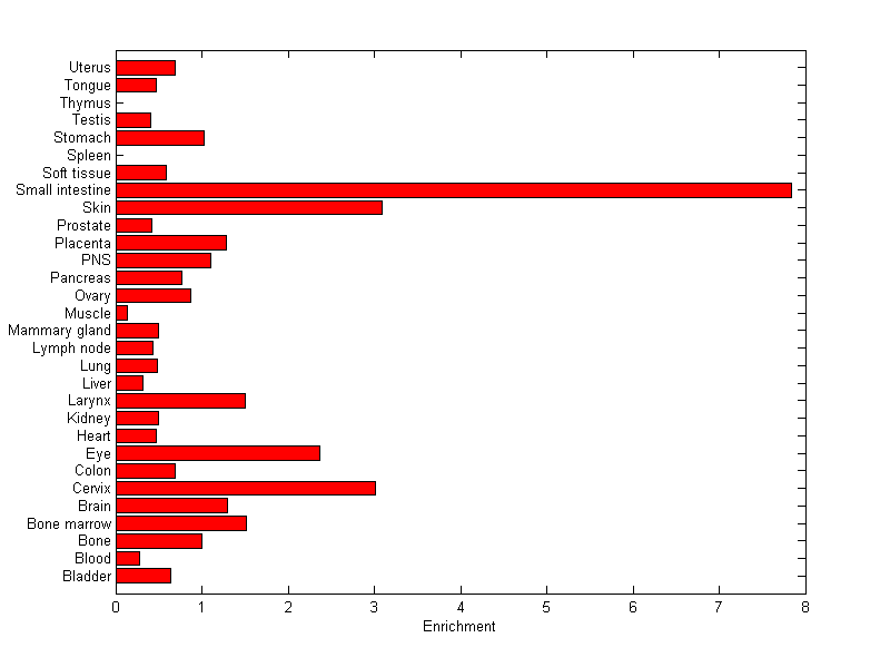 About the profile: The expression level is normalized with tissue-library size. Each value for a gene in a tissue is a ratio of observed ESTs to the expected one in this tissue. The expected number of ESTs is the product of total ESTs of the gene and the fraction of total ESTs in the tissue among all ESTs in 30 tissues. Summary: This gene is preferentially expressed in [small_intestine] Download: |