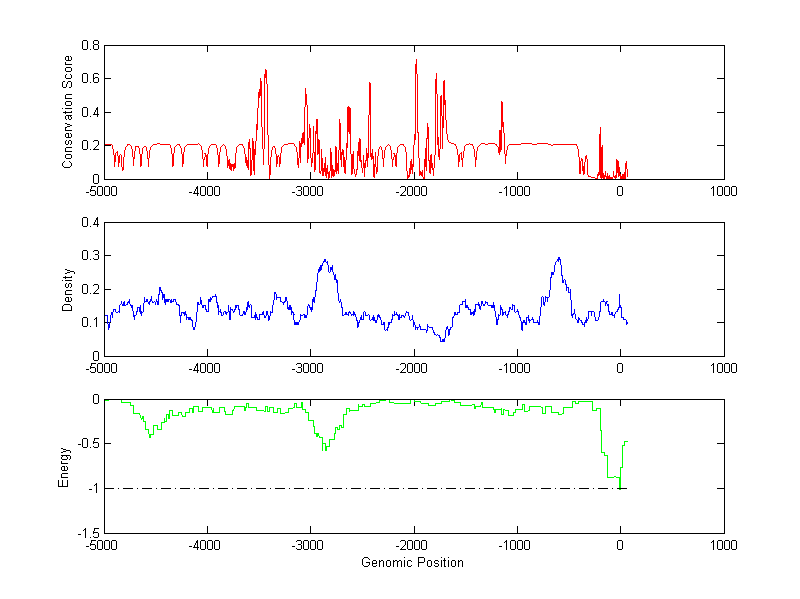 About the profiles: The conservation profile (red curve) is about conservation scores of the promoter sequences. Conservation was determined from an eight-way alignment of human, chimpanzee, dog, mouse, rat, chicken, zebrafish and fugu sequences. The conservation was quantified by a conservation score between 0 and 1, with 1 as highest conservation. The conservation score was obtained from UCSC genome databases. The density profile (blue curve) is about density of all TF binding sites. The energy profile (green curve) is about energy for module detection based on TF interaction. The positions with energy less than -1 indicate the existence of CRMs. Download: Conservation profileDensity profile Energy profile CRM summary |