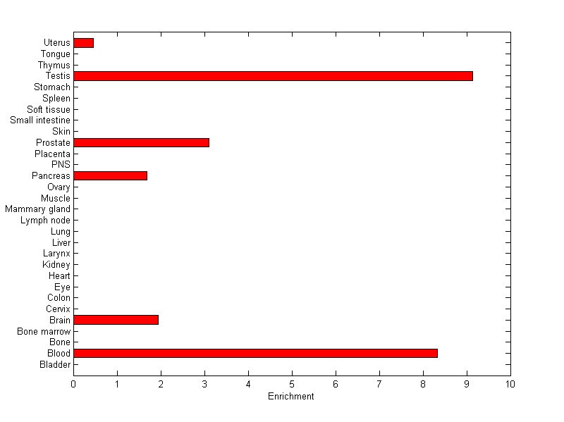 About the profile: The expression level is normalized with tissue-library size. Each value for a gene in a tissue is a ratio of observed ESTs to the expected one in this tissue. The expected number of ESTs is the product of total ESTs of the gene and the fraction of total ESTs in the tissue among all ESTs in 30 tissues. Summary: This gene is preferentially expressed in [blood, testis] Download: |