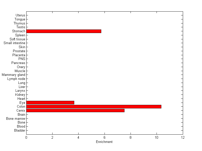 The expression level is normalized with tissue-library size. Each value for a gene in a tissue is a ratio of observed ESTs to the expected one in this tissue. The expected number of ESTs is the product of total ESTs of the gene and the fraction of total ESTs in the tissue among all ESTs in 30 tissues.