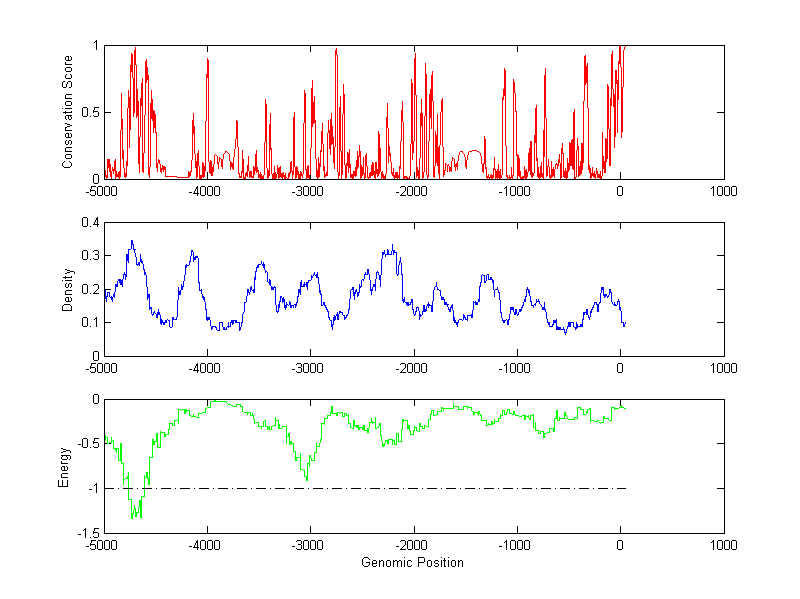 The energy profile (green curve) is about energy for module detection based on TF interaction. The positions with energy less than -1 indicate the existence of CRMs.