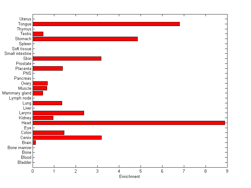 The expression level is normalized with tissue-library size. Each value for a gene in a tissue is a ratio of observed ESTs to the expected one in this tissue. The expected number of ESTs is the product of total ESTs of the gene and the fraction of total ESTs in the tissue among all ESTs in 30 tissues.