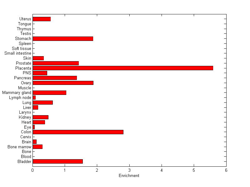 The expression level is normalized with tissue-library size. Each value for a gene in a tissue is a ratio of observed ESTs to the expected one in this tissue. The expected number of ESTs is the product of total ESTs of the gene and the fraction of total ESTs in the tissue among all ESTs in 30 tissues.