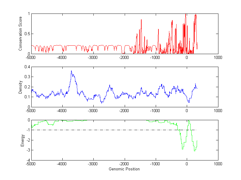 The energy profile (green curve) is about energy for module detection based on TF interaction. The positions with energy less than -1 indicate the existence of CRMs.