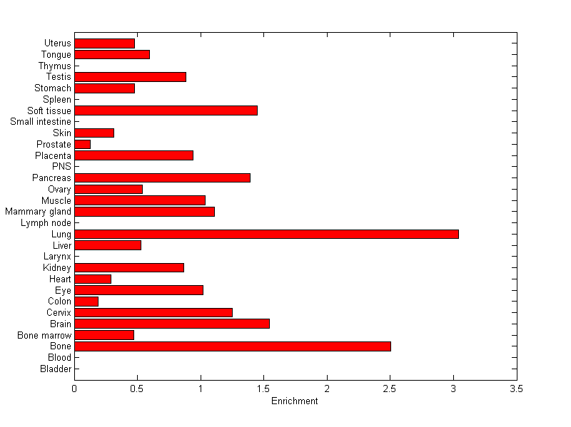 The expression level is normalized with tissue-library size. Each value for a gene in a tissue is a ratio of observed ESTs to the expected one in this tissue. The expected number of ESTs is the product of total ESTs of the gene and the fraction of total ESTs in the tissue among all ESTs in 30 tissues.