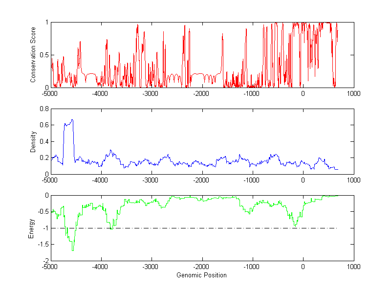 The energy profile (green curve) is about energy for module detection based on TF interaction. The positions with energy less than -1 indicate the existence of CRMs.