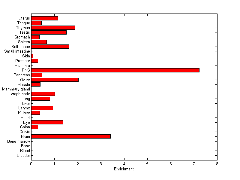 The expression level is normalized with tissue-library size. Each value for a gene in a tissue is a ratio of observed ESTs to the expected one in this tissue. The expected number of ESTs is the product of total ESTs of the gene and the fraction of total ESTs in the tissue among all ESTs in 30 tissues.