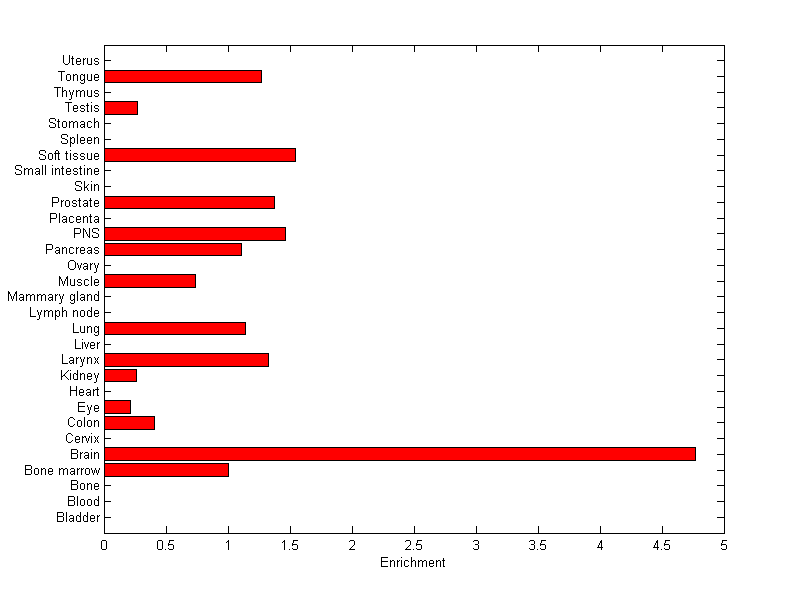 The expression level is normalized with tissue-library size. Each value for a gene in a tissue is a ratio of observed ESTs to the expected one in this tissue. The expected number of ESTs is the product of total ESTs of the gene and the fraction of total ESTs in the tissue among all ESTs in 30 tissues.
