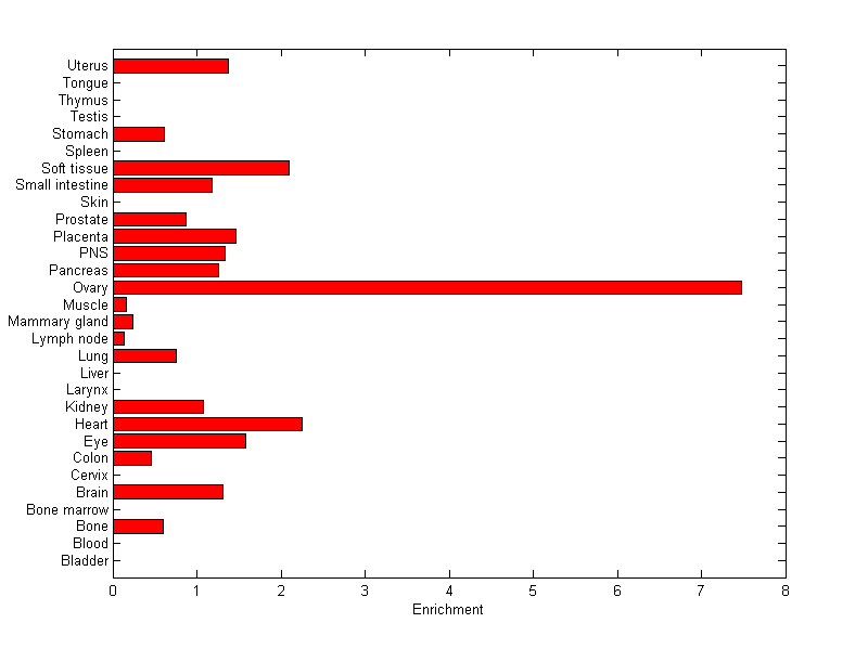 About the profile: The expression level is normalized with tissue-library size. Each value for a gene in a tissue is a ratio of observed ESTs to the expected one in this tissue. The expected number of ESTs is the product of total ESTs of the gene and the fraction of total ESTs in the tissue among all ESTs in 30 tissues. Summary: This gene is preferentially expressed in [ovary] Download: |