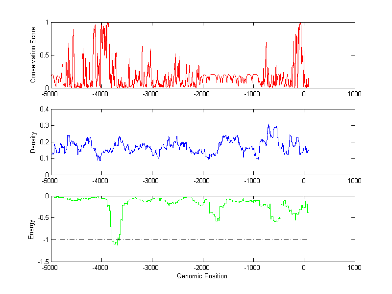 The energy profile (green curve) is about energy for module detection based on TF interaction. The positions with energy less than -1 indicate the existence of CRMs.