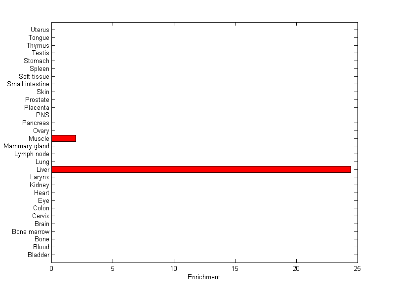 The expression level is normalized with tissue-library size. Each value for a gene in a tissue is a ratio of observed ESTs to the expected one in this tissue. The expected number of ESTs is the product of total ESTs of the gene and the fraction of total ESTs in the tissue among all ESTs in 30 tissues.