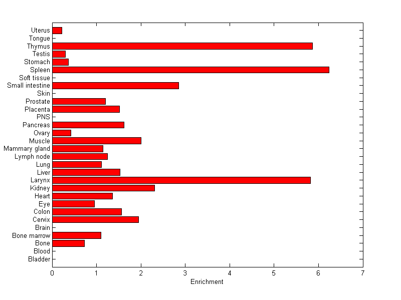 The expression level is normalized with tissue-library size. Each value for a gene in a tissue is a ratio of observed ESTs to the expected one in this tissue. The expected number of ESTs is the product of total ESTs of the gene and the fraction of total ESTs in the tissue among all ESTs in 30 tissues.