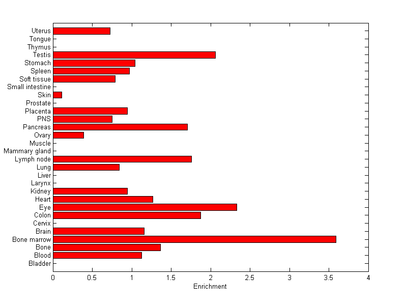 The expression level is normalized with tissue-library size. Each value for a gene in a tissue is a ratio of observed ESTs to the expected one in this tissue. The expected number of ESTs is the product of total ESTs of the gene and the fraction of total ESTs in the tissue among all ESTs in 30 tissues.