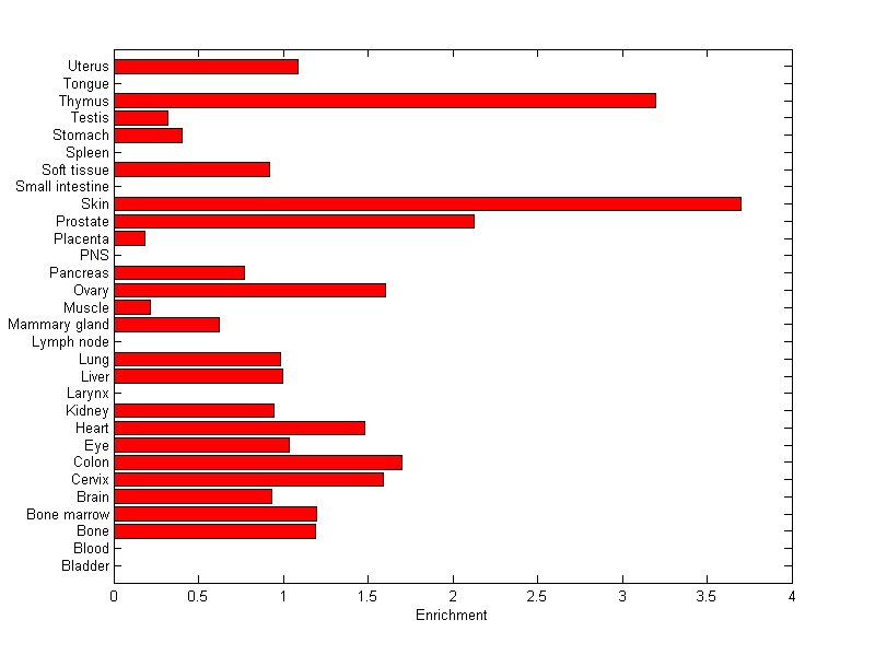 The expression level is normalized with tissue-library size. Each value for a gene in a tissue is a ratio of observed ESTs to the expected one in this tissue. The expected number of ESTs is the product of total ESTs of the gene and the fraction of total ESTs in the tissue among all ESTs in 30 tissues.