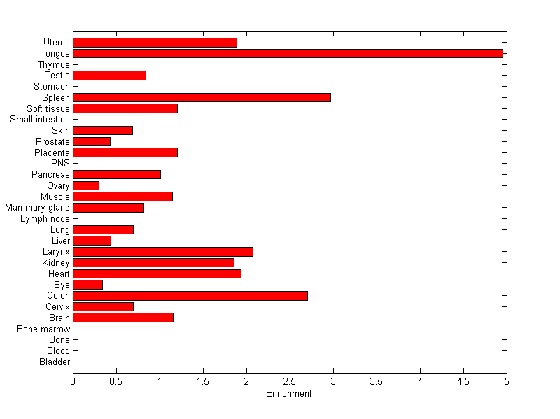 The expression level is normalized with tissue-library size. Each value for a gene in a tissue is a ratio of observed ESTs to the expected one in this tissue. The expected number of ESTs is the product of total ESTs of the gene and the fraction of total ESTs in the tissue among all ESTs in 30 tissues.