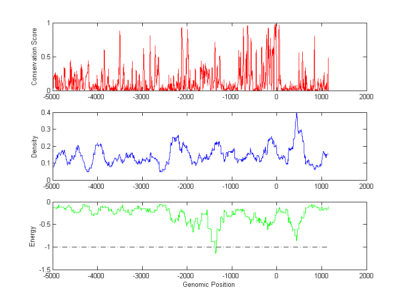 About the profiles: The conservation profile (red curve) is about conservation scores of the promoter sequences. Conservation was determined from an eight-way alignment of human, chimpanzee, dog, mouse, rat, chicken, zebrafish and fugu sequences. The conservation was quantified by a conservation score between 0 and 1, with 1 as highest conservation. The conservation score was obtained from UCSC genome databases. The density profile (blue curve) is about density of all TF binding sites. The energy profile (green curve) is about energy for module detection based on TF interaction. The positions with energy less than -1 indicate the existence of CRMs. Download: Conservation profileDensity profile Energy profile CRM summary |