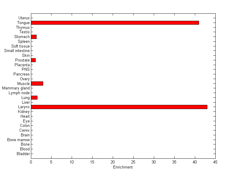 About the profile: The expression level is normalized with tissue-library size. Each value for a gene in a tissue is a ratio of observed ESTs to the expected one in this tissue. The expected number of ESTs is the product of total ESTs of the gene and the fraction of total ESTs in the tissue among all ESTs in 30 tissues. Summary: This gene is preferentially expressed in [larynx, tongue] Download: |