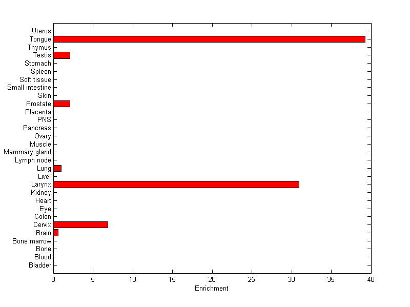The expression level is normalized with tissue-library size. Each value for a gene in a tissue is a ratio of observed ESTs to the expected one in this tissue. The expected number of ESTs is the product of total ESTs of the gene and the fraction of total ESTs in the tissue among all ESTs in 30 tissues.