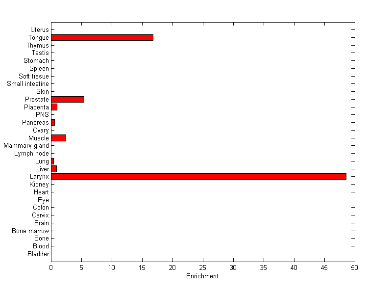 About the profile: The expression level is normalized with tissue-library size. Each value for a gene in a tissue is a ratio of observed ESTs to the expected one in this tissue. The expected number of ESTs is the product of total ESTs of the gene and the fraction of total ESTs in the tissue among all ESTs in 30 tissues. Summary: This gene is preferentially expressed in [larynx, tongue] Download: |