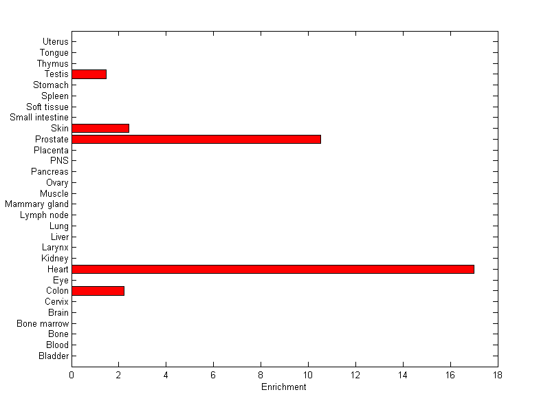 About the profile: The expression level is normalized with tissue-library size. Each value for a gene in a tissue is a ratio of observed ESTs to the expected one in this tissue. The expected number of ESTs is the product of total ESTs of the gene and the fraction of total ESTs in the tissue among all ESTs in 30 tissues. Summary: This gene is preferentially expressed in [heart, prostate] Download: |