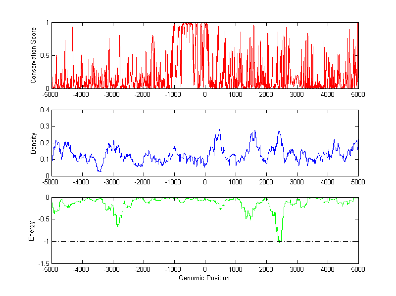 The energy profile (green curve) is about energy for module detection based on TF interaction. The positions with energy less than -1 indicate the existence of CRMs.