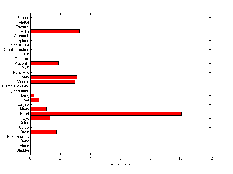 The expression level is normalized with tissue-library size. Each value for a gene in a tissue is a ratio of observed ESTs to the expected one in this tissue. The expected number of ESTs is the product of total ESTs of the gene and the fraction of total ESTs in the tissue among all ESTs in 30 tissues.