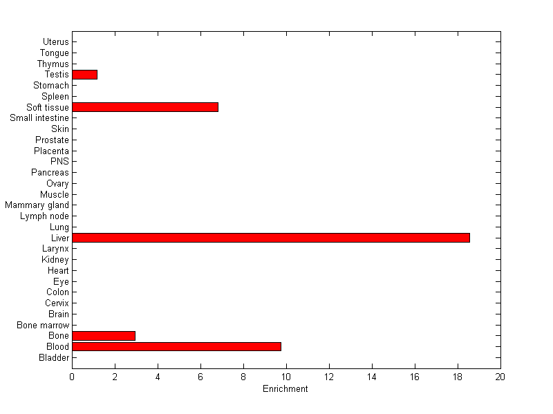 About the profile: The expression level is normalized with tissue-library size. Each value for a gene in a tissue is a ratio of observed ESTs to the expected one in this tissue. The expected number of ESTs is the product of total ESTs of the gene and the fraction of total ESTs in the tissue among all ESTs in 30 tissues. Summary: This gene is preferentially expressed in [liver] Download: |
