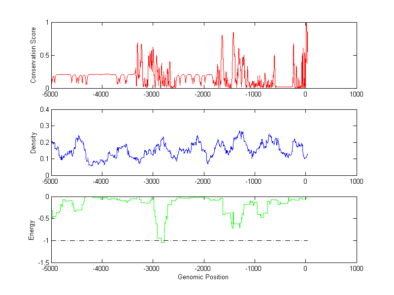 The energy profile (green curve) is about energy for module detection based on TF interaction. The positions with energy less than -1 indicate the existence of CRMs.