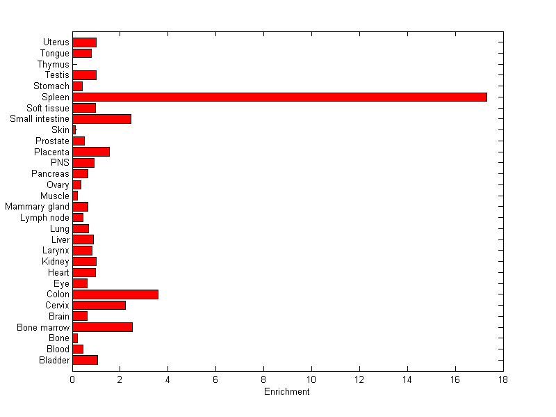 The expression level is normalized with tissue-library size. Each value for a gene in a tissue is a ratio of observed ESTs to the expected one in this tissue. The expected number of ESTs is the product of total ESTs of the gene and the fraction of total ESTs in the tissue among all ESTs in 30 tissues.