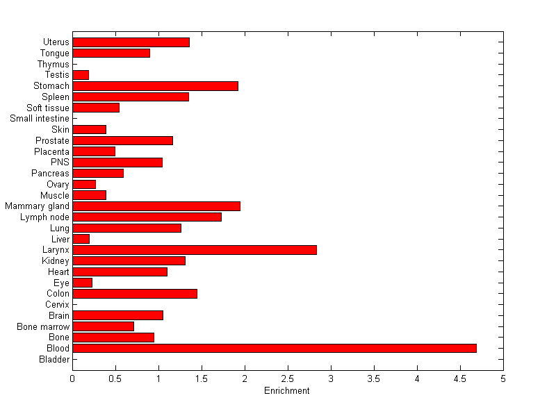 The expression level is normalized with tissue-library size. Each value for a gene in a tissue is a ratio of observed ESTs to the expected one in this tissue. The expected number of ESTs is the product of total ESTs of the gene and the fraction of total ESTs in the tissue among all ESTs in 30 tissues.