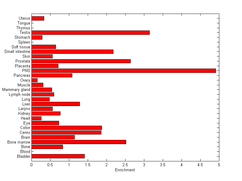 The expression level is normalized with tissue-library size. Each value for a gene in a tissue is a ratio of observed ESTs to the expected one in this tissue. The expected number of ESTs is the product of total ESTs of the gene and the fraction of total ESTs in the tissue among all ESTs in 30 tissues.