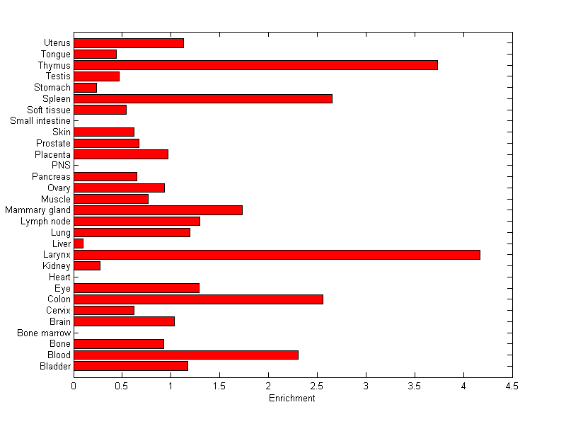 The expression level is normalized with tissue-library size. Each value for a gene in a tissue is a ratio of observed ESTs to the expected one in this tissue. The expected number of ESTs is the product of total ESTs of the gene and the fraction of total ESTs in the tissue among all ESTs in 30 tissues.
