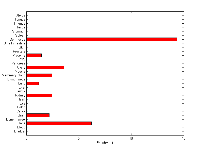 The expression level is normalized with tissue-library size. Each value for a gene in a tissue is a ratio of observed ESTs to the expected one in this tissue. The expected number of ESTs is the product of total ESTs of the gene and the fraction of total ESTs in the tissue among all ESTs in 30 tissues.